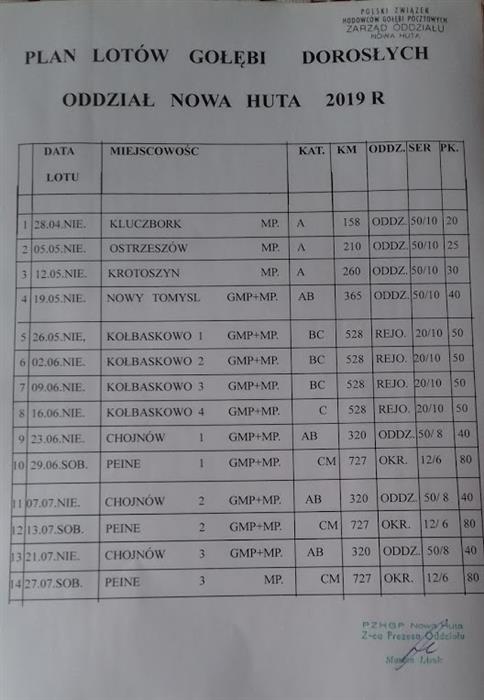 W dziale DOKUMENTY >> znajduje się zatwierdzony plan lotów gołębi dorosłych oraz współzawodnictwo gołębi dorosłych i młodych oddziału Nowa Huta na 2019 rok.