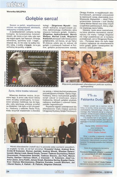 Zbigniew Oleksiak- podziękowanie za darowanie gołebia na aukcje charytatywną.